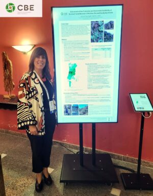 Sónia Figo, gestora de projetos do CBE, apresentou o póster sobre a produção e disponibilidade sustentável de biomassa florestal residual em povoamentos de pinheiro-bravo e eucalipto (Assessment of the Production and Sustainable Availability of Residual Forest Biomass in Maritime Pine and Eucalyptus Stands), juntamente com Luís Gil.